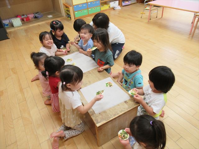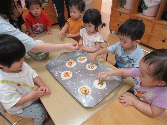 園庭の畑で育ったピーマン、ナスやバジルを使ってピザ作りをしました。 餃子の皮にケチャップをぬり、その上に野菜とチーズを乗せました。 焼いているホットプレートの近くには焼き上がりを楽しみにしている子どもたちの姿がありました。 野菜が苦手な子も「おいしい!」とパクパク食べていました。