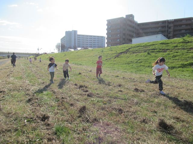 毎朝園庭や公園でマラソンをして、寒い中でも体を動かすことでぽかぽかと温まることを感じてきました。 この日は藻川の堤防に行き、5歳児2㎞、4歳児1.5㎞、3歳児1㎞を目標に走りました。 自分のペースで最後まで走りきった子どもたちは、とてもいい表情でした。